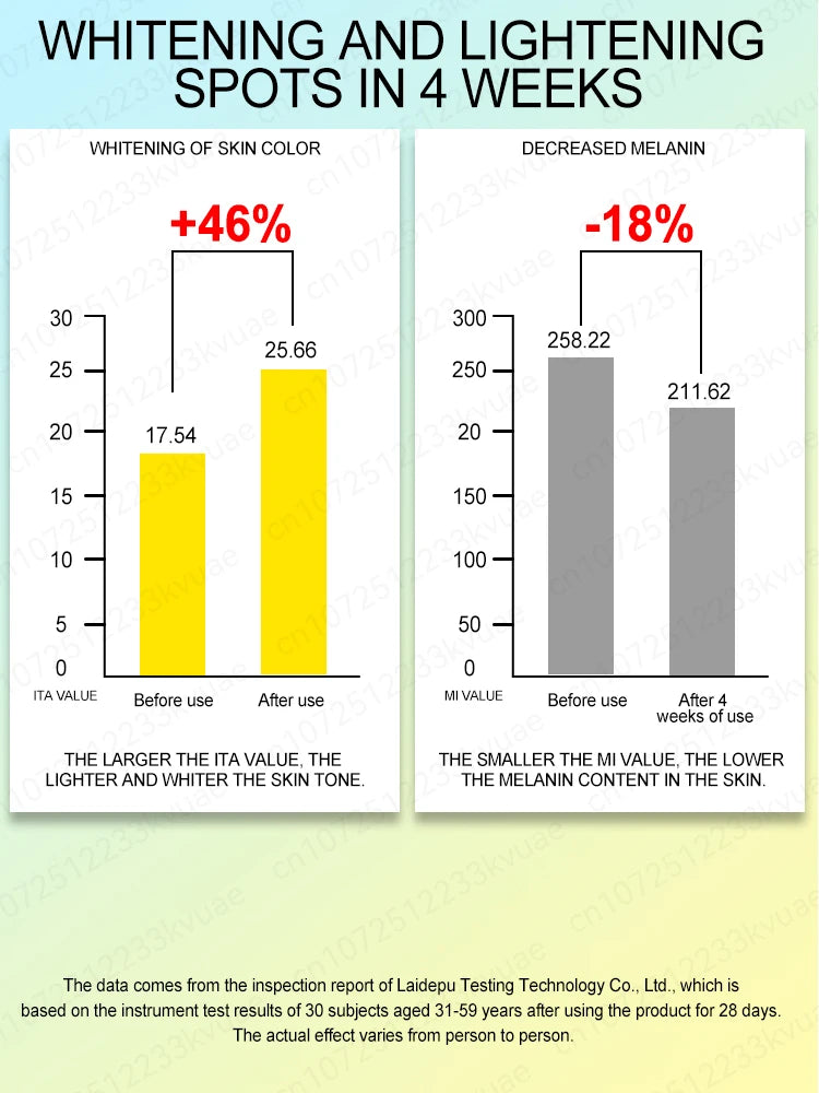 This 377 Whitening and Spot Removal Essence contains highly effective whitening ingredients, especially the 377 compound, which effectively inhibits melanin production, fades existing spots, and evens out skin tone. Its lightweight texture is easily absorbed and suitable for all skin types. Continuous use helps improve dull skin, restoring brightness and radiance. The gentle formula is non-irritating, and long-term use will rejuvenate your skin, revealing a more youthful and flawless complexion.