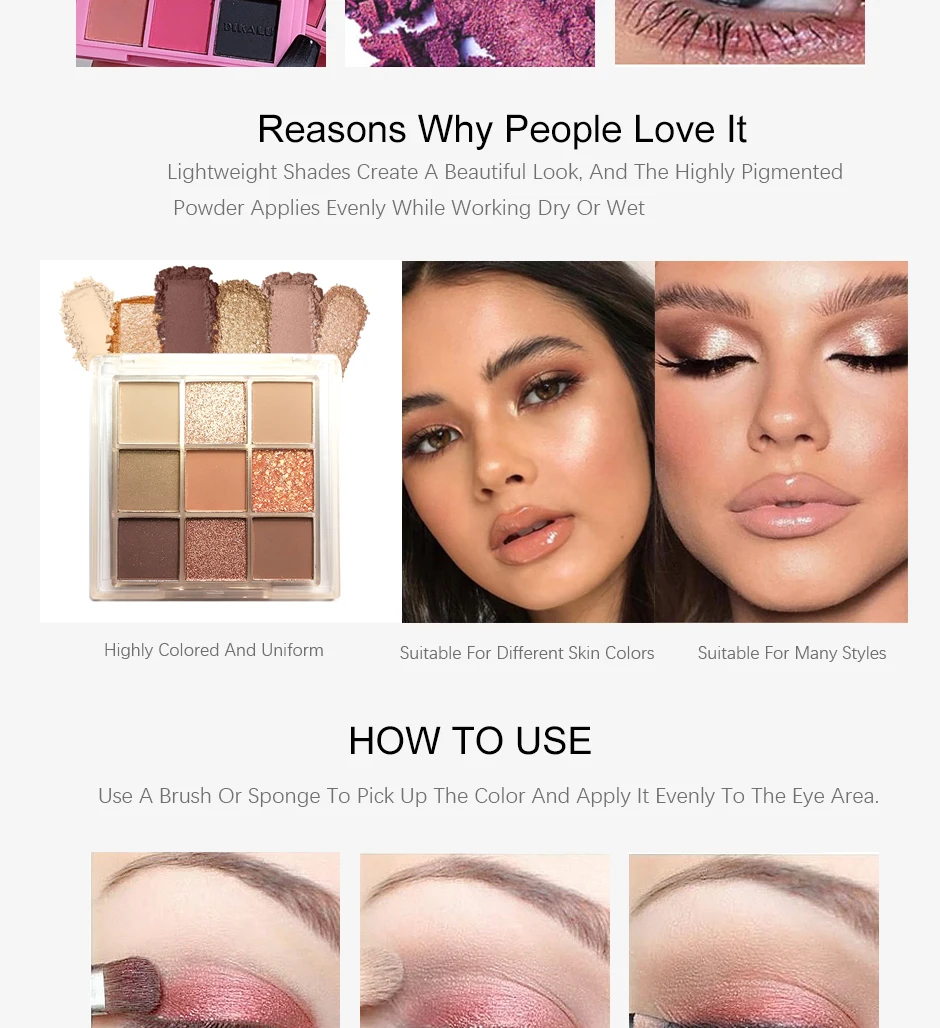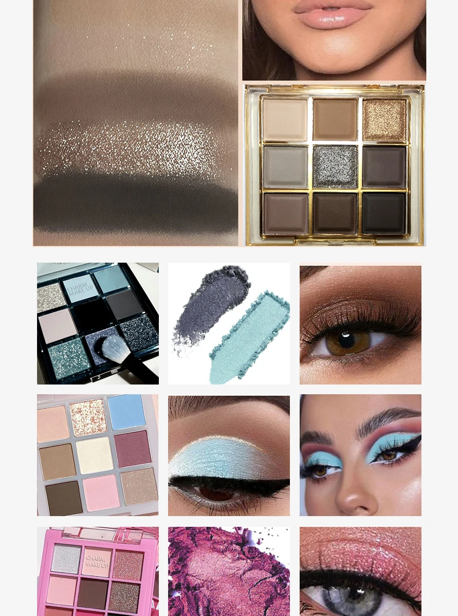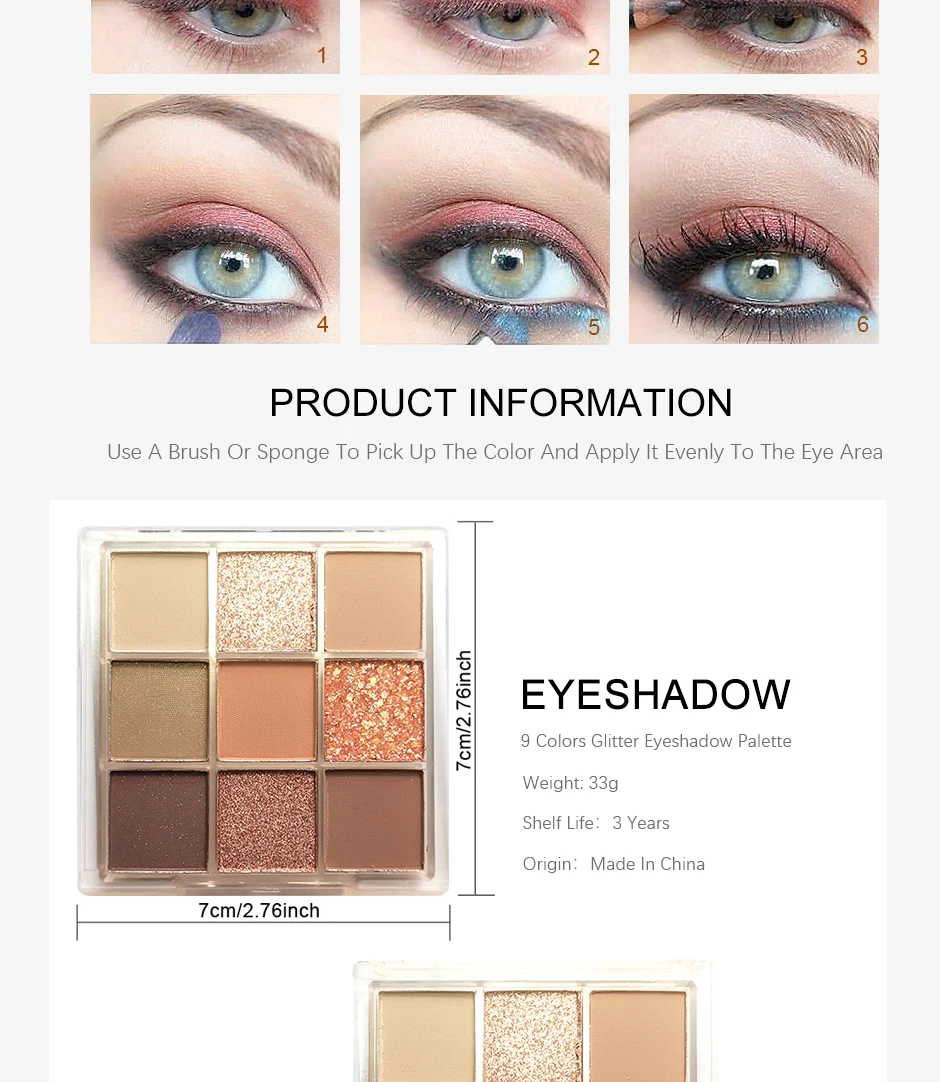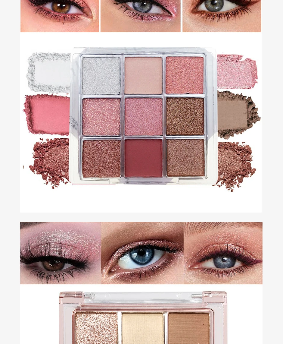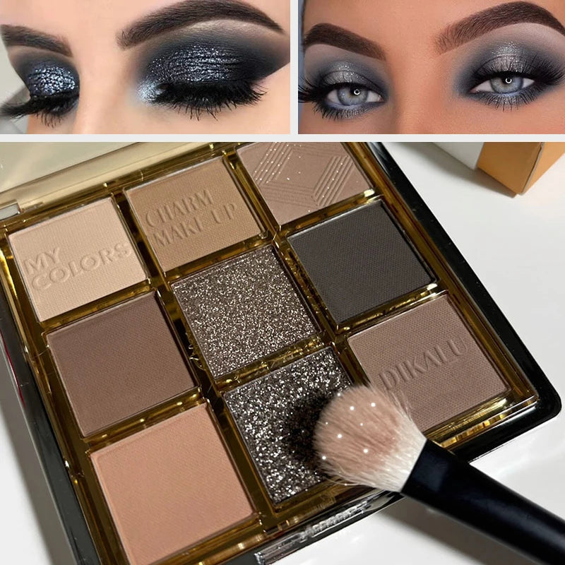 Eyeshadow Palette: This professional level makeup palette features 9 highly pigmented shadows that glide onto lids and make eyes pop with color;