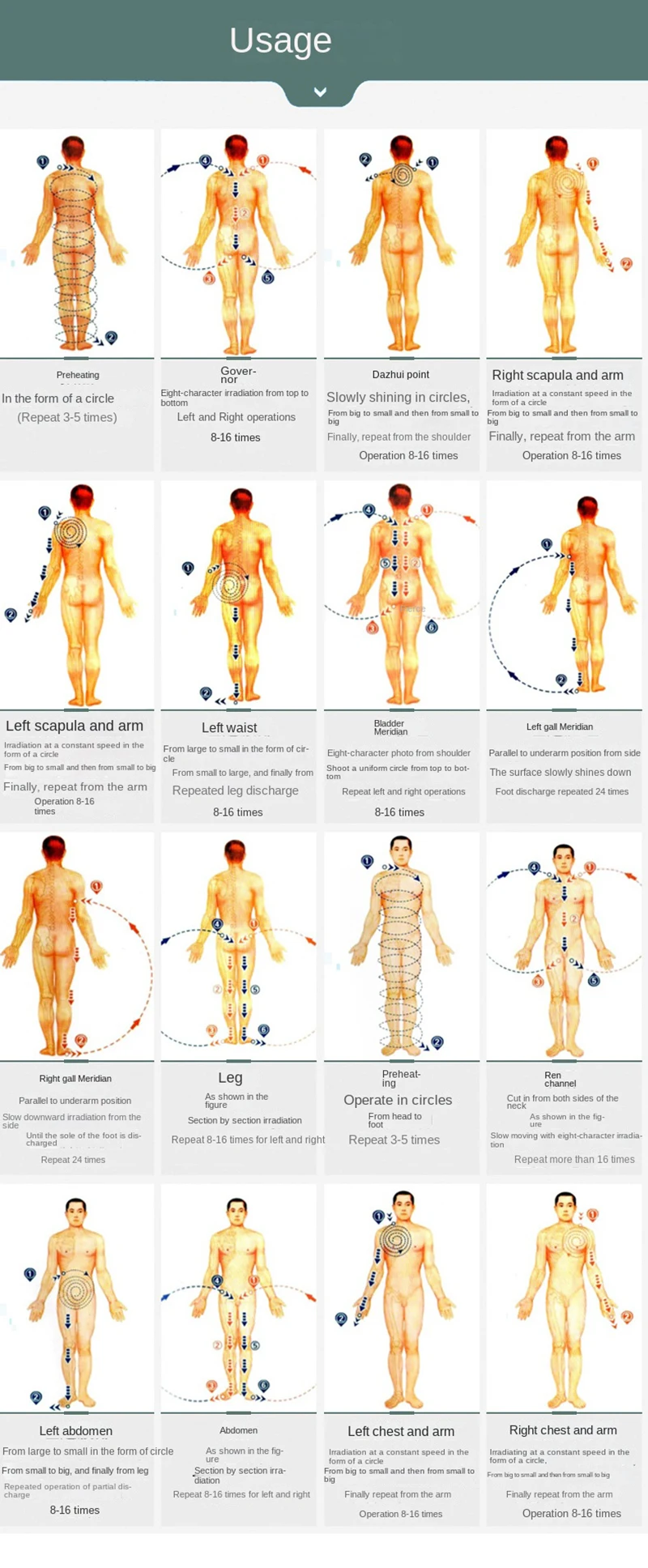 explosive destruction of cells, activation of emotional cells, enhancement of self-healing power, clearing of meridian lymph,improving microcirculation, caring for life glands, beautifying skin care, removing cold and dampness, softening and firming knots