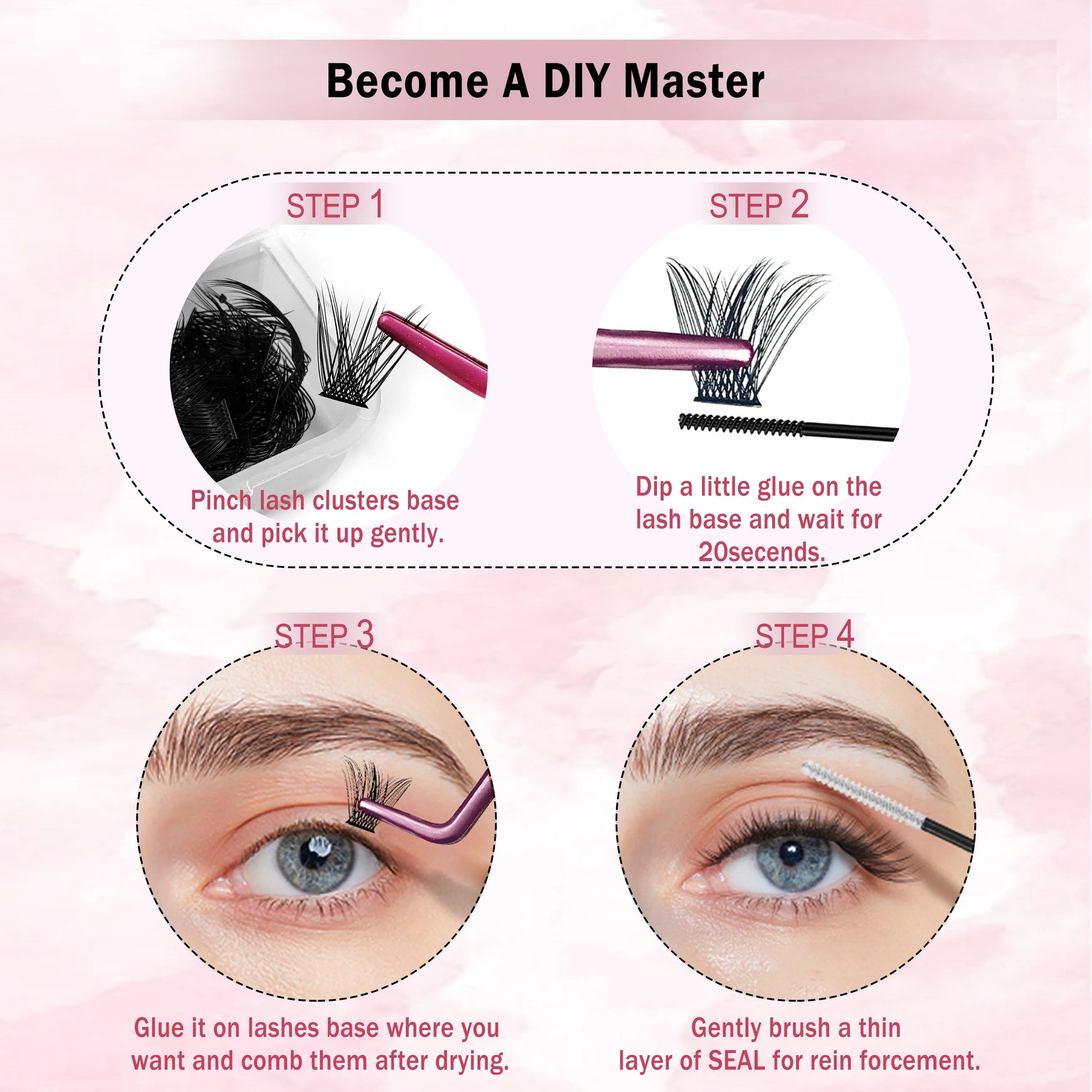 3.【How to use】Apply the mascara wand cluster lash glue to your natural lashes and wait about 30 seconds. Then remove the C/D curl lash clusters from the box, and apply the lash cluster underneath your natural eyelashes, away 2-3 mm from the eyelid! Finally, start your new day with your new eyelash!