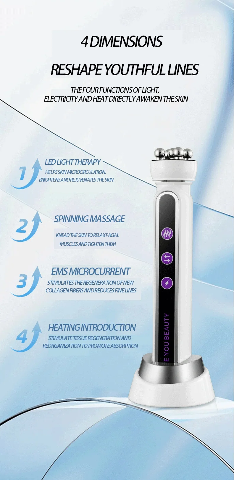 -360 Degree rotating EMS machine with led light and heating, is the newest treatment technique available to effectively tighten sagging skin and reduce wrinkles and improve skin's elasticity and brighten skin tone.