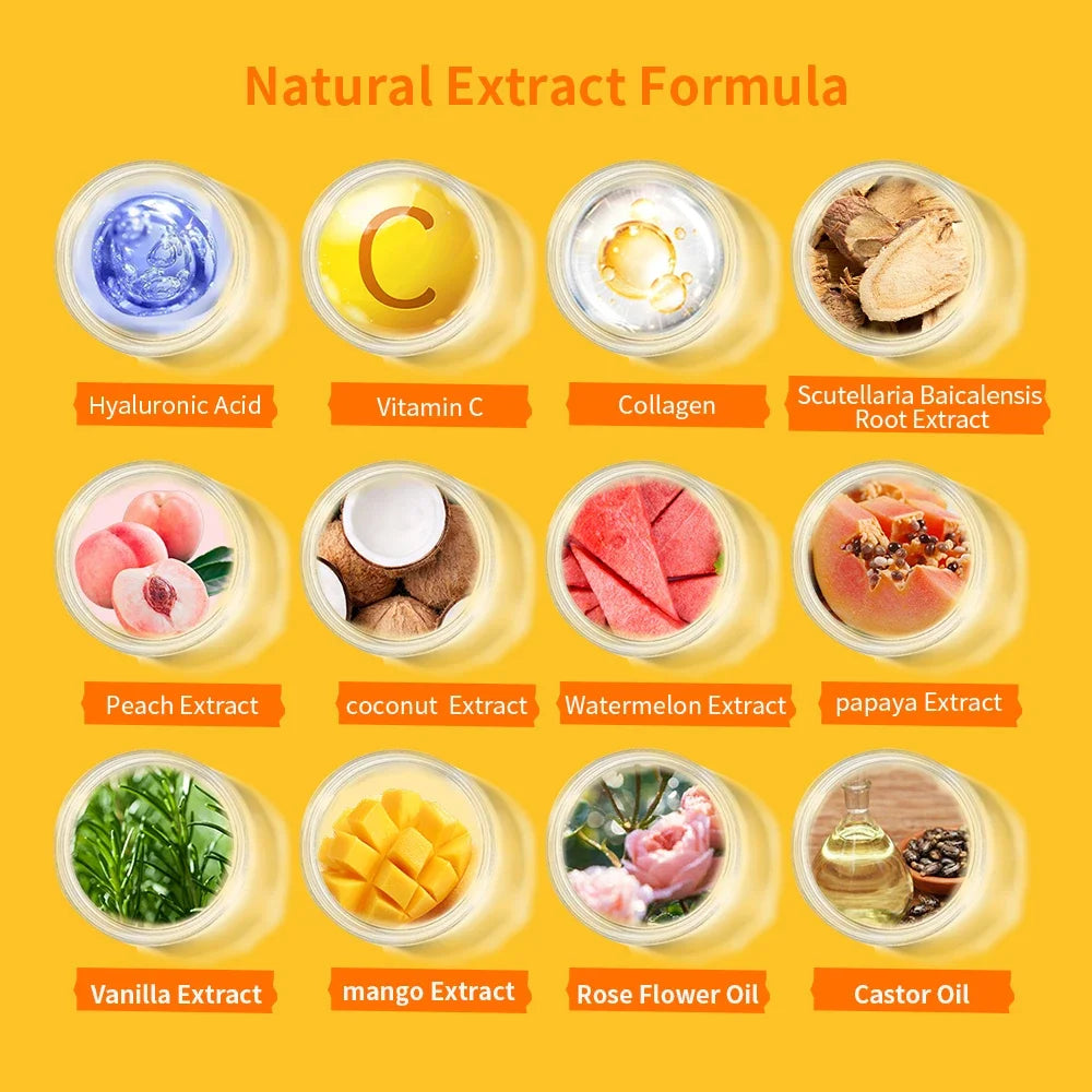 Aqua, Glycerin, Propylene Glycol,Hyaluronic Acid,Vitamin C,Collagen,Scutellaria Baicalensis Root Extract,Chaenomeles Sinensis(papaya) Fruit Extract,Mango Extract,Allantoin,Malus Domestica Fruit Extract,Sorbicacid,Glyceryl Stearate,PEG-100 Stearate,PEG-40hydrogenated Castor Oil,Trehalose,Rose Flower Oil,Fragrance.