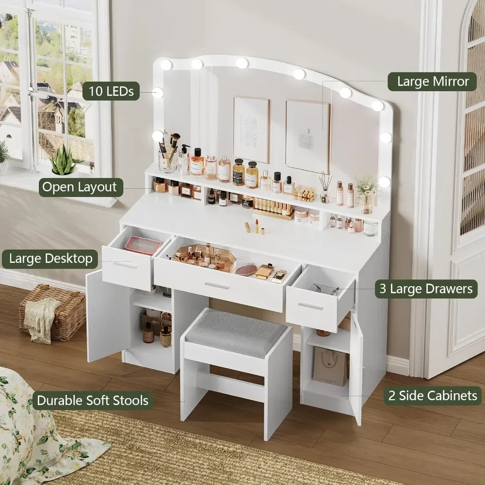 - 💄【Vanity Set with Super Large Mirror】With full size large lighted mirror makeup vanity( Mirror Size: 39.4"L*22.4"W), you will no longer need to move your body from side to side to search for the best makeup angle like in the past! Fine selection of high-definition makeup mirror, easier to view your makeup details, whether prepping for a new day in the early morning or gearing up for a dinner date, you'll be perfectly perched this vanity with large mirror