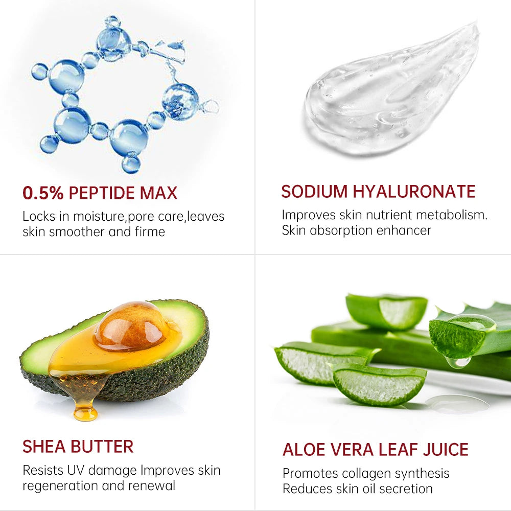 AQUA、ISOPROPYL MYRISTATE、GLYCERIN、BUTYLENE GLYCOL、BUTYROSPERMUM PARKII (SHEA) BUTTER、CAPRYLIC/CAPRIC TRIGLYCERIDE、CETEARYL ALCOHOL、CETEARYL ALCOHOL、DIMETHICONE、HYDROGENATED POLYISOBUTENE、METHYL HYDROGENATED ROSINATE、GLYCERYL STEARATE、PROPYLENE GLYCOL、NIACINAMIDE、CETEARYL GLUCOSIDE、ALLANTOIN、POLYACRYLAMIDE、ACRYLATES/C10-30 ALKYL ACRYLATE CROSSPOLYMER、C13-14 ISOPARAFFIN、TOCOPHERYL ACETATE、ARGININE、CAPRYLHYDROXAMIC ACID、1,2-HEXANEDIOL、ETHYLHEXYLGLYCERIN、LAURETH-7、DISODIUM EDTA、SODIUM HYALURONATE、XANTHAN GUM、CHAMOMILLA RECUTITA (MATRICARIA) FLOWER EXTRACT、MALVA SYLVESTRIS (MALLOW) FLOWER EXTRACT、PAEONIA ALBIFLORA ROOT EXTRACT、TARAXACUM OFFICINALE (DANDELION) RHIZOME/ROOT EXTRACT、VIOLA YEDOENSIS EXTRACT、GLUCOSE、PHENOXYETHANOL、ALOE BARBADENSIS LEAF JUICE、KINGINKA EKISU、POLYSORBATE 20、LACTIC ACID、CARNOSINE、ACETYL HEXAPEPTIDE-8、PALMITOYL PENTAPEPTIDE-4、PALMITOYL TRIPEPTIDE-1.