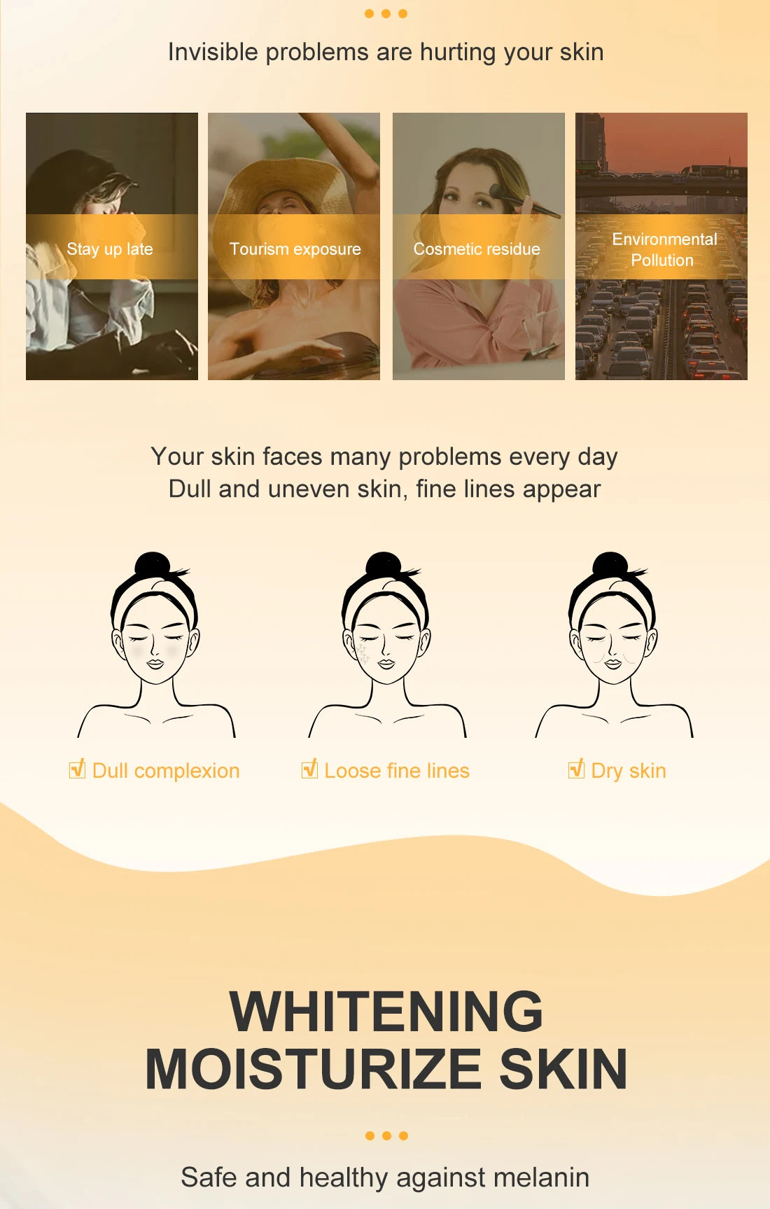 High-concentration VC factor and multiple whitening active ingredients can effectively lock skin moisture, repair skin quickly, decompose melanin in skin and reduce melanin production, brighten skin tone, whiten skin, and also improve pigmentation and lighten the role of pigmentation, make the skin white, clear and elastic.