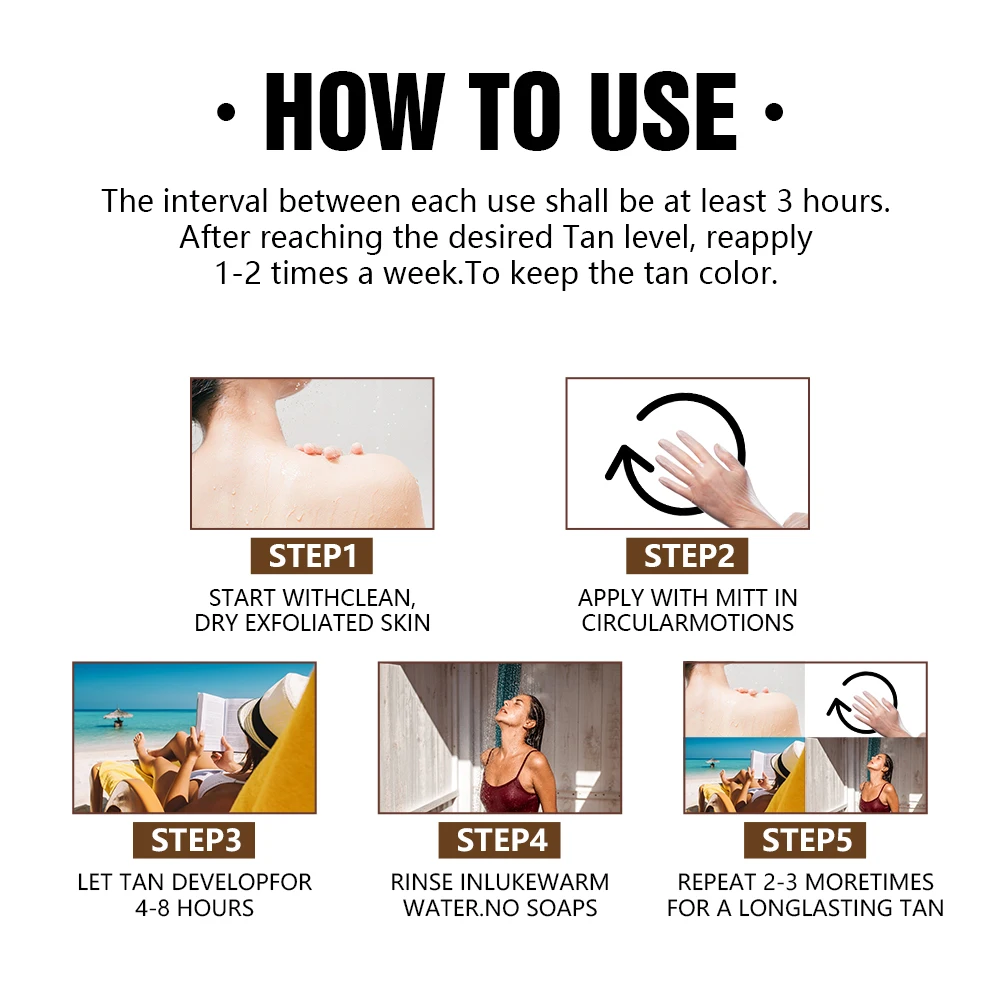 To achieve gradual tan, apply the self tanning cream evenly to your body & face in circular motions, allow it to dry completely & wait for 4-6 hours before showering or swimming. Repeat the application every few days to maintain the tropic glow.
