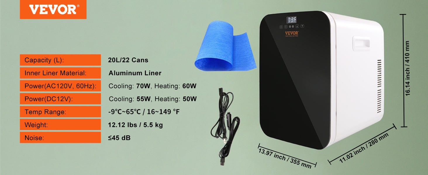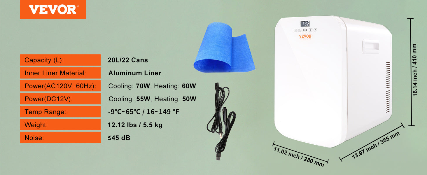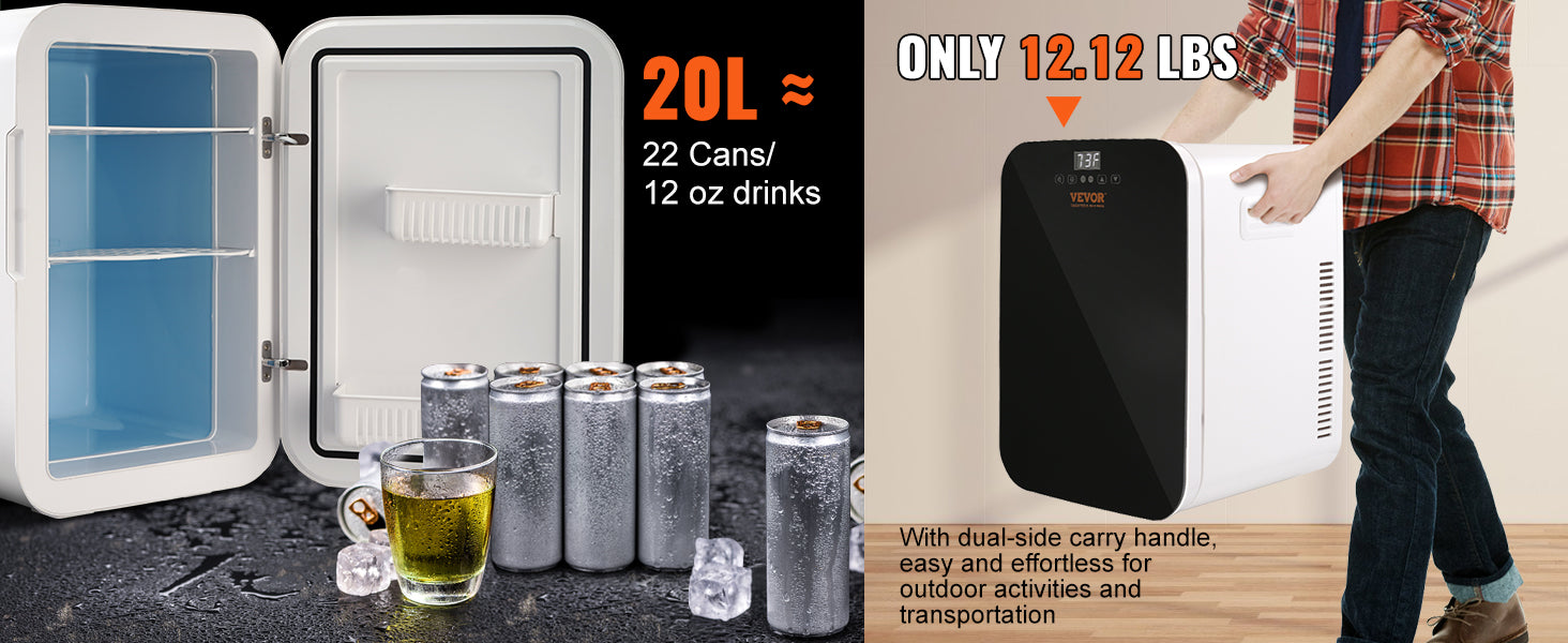 Compact but Spacious: Our mini-fridge features a small body, but it can hold up to 22 cans of 330ml beverage in its 20L capacity, weighing only 12.12lbs. Both sides are equipped with carrying handles to make it portable and easy to carry, ideal for storing food, drinks, breast milk, skincare products, medicine, and more.